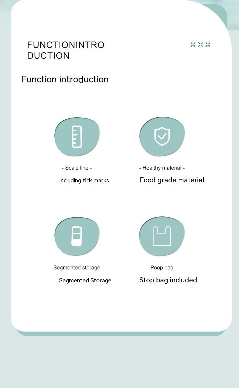 - Design: Three-in-one portable cup with separate sections for water, food, and waste bags