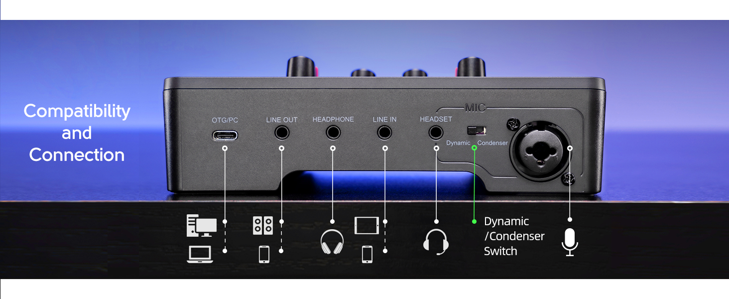 - Warm Tips: 1.) USB-C to USB-A/C cable used to connect mixer and computer via Type-C interface on the mixer. 3.5mm to 3.5mm audio cable used to connect mixer and 3.5mm audio device (like phone or tablet) via LINE IN on the mixer 2.) XLR cable NOT included. 3.) Input Interface: Mic, LINE IN and Headset. 4.) Output Interface: Headphones, LINE OUT and Headset.