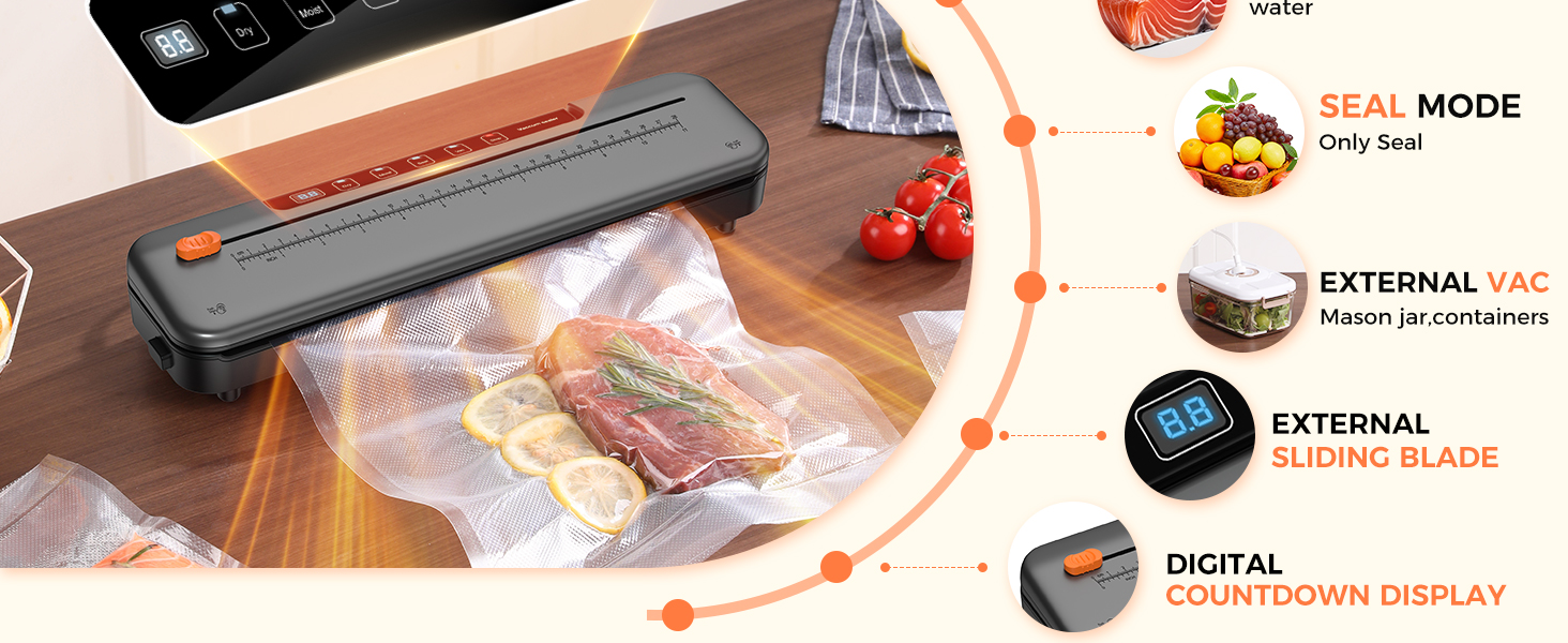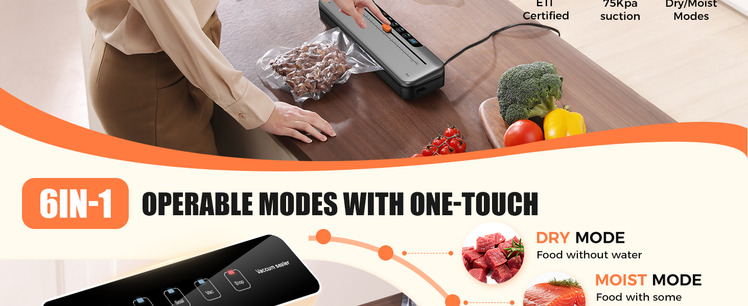 Multiple Sealing Modes: Choose from different modes depending on the food item (dry or moist foods, as well as vacuum or