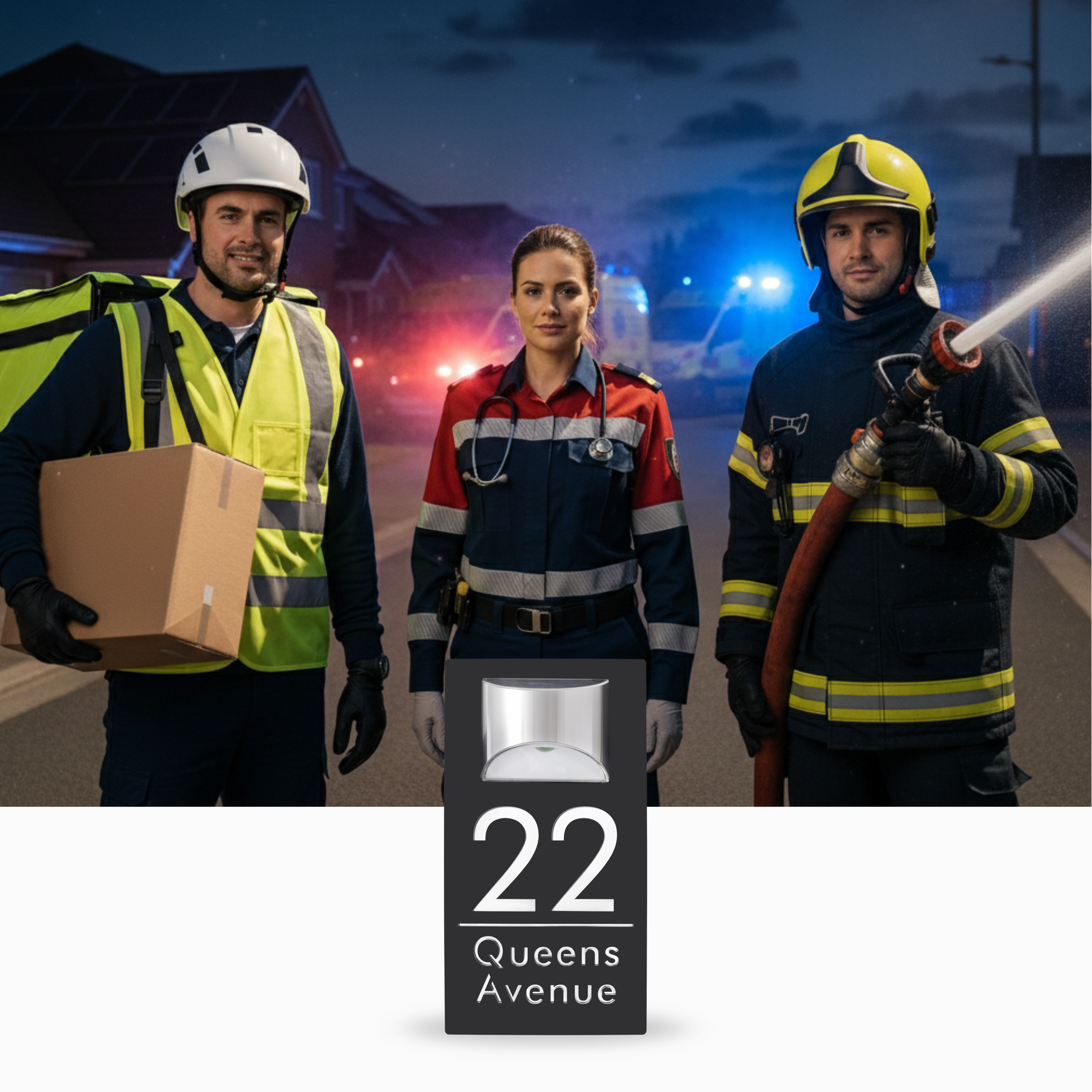 Experts and frontline responders agree: clear, visible house numbers save time. A solar-powered address plaque ensures your home can be found day or night.