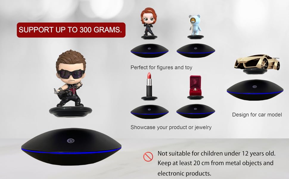 •How to Use: Make Sure the Unit is Installed on a Flat Surface. Hold the base with Both Hands and Place it Vertically over the Center of the Base. You Can Use the Accessory to Find the Center Point. when You Feel a Strong Force, Let the the base Go. it Will Levitate and you can put your item on it, remenber no more than 350g