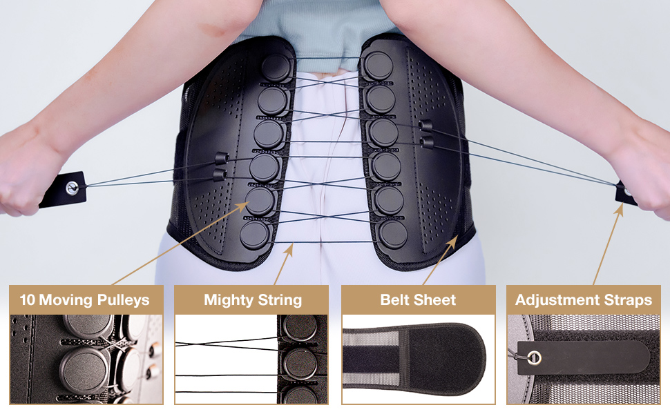 - Our Lumbar Support Back Brace supports your back in 4 unique ways: a tighter fixation, 10 moving pulleys to fix the belt firmly in place, adjustable Velcro strap and durable string to modify support for your comfort.
