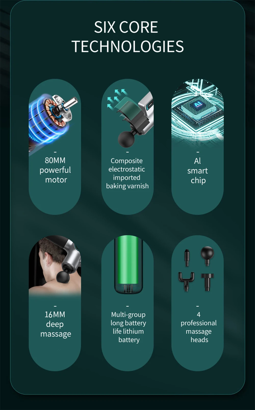Interchangeable Massage Heads: Each head is designed for specific muscle areas, allowing you to target different muscle