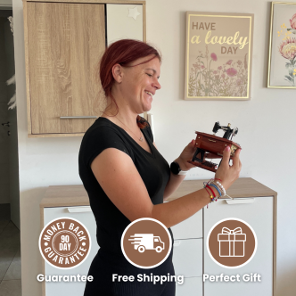 ✓ Summer deal package includes - Sewing machine-shaped music box (6.3" H × 4.7" L × 3" W / 16 cm × 12 cm × 7.5 cm), music box e-Instructions, and four bonuses: Vintage sewing machine necklace, 4 vintage sewing patterns + guides, vintage music playlist, and 15 sewing art printables.